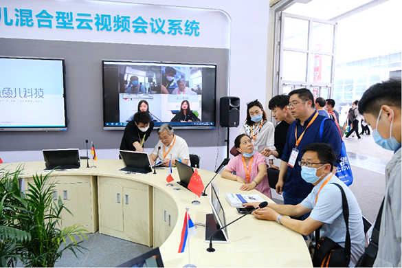 在“小鱼儿混合型云视频会议系统”展区,摆放着本地会议室经常采用的圆型会议桌,墙面左侧的大屏上展示会议系统控制端操作界面的动态,右侧挂有一块特殊的屏幕,一场有北京和上海远端代表参会的“本地+云端混合的圆桌会议”被搬到了展会现场。